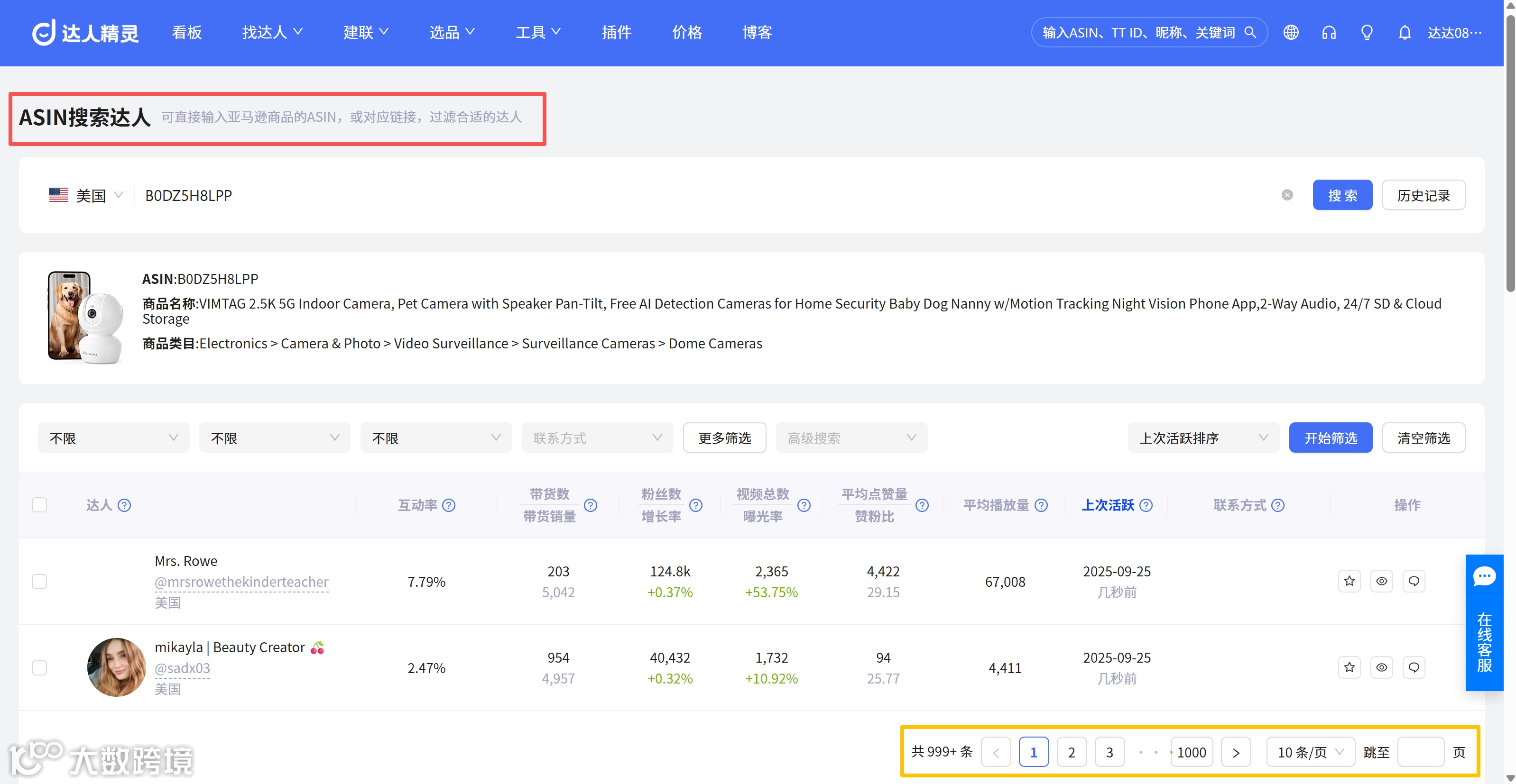 某宠物用品卖家手动搜索3天,仅找到30位达人且无法评估数据。采用ASIN反查工具后,1分钟内生成1000+达人名单,并附带互动率、粉丝量、预估带货数据等关键指标,筛选效率提升10倍以上。