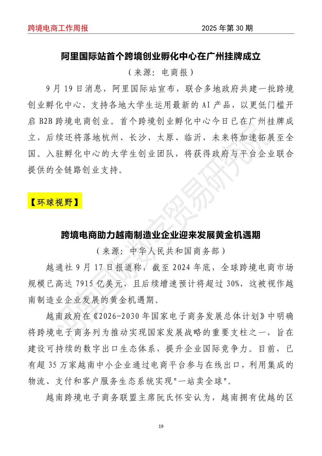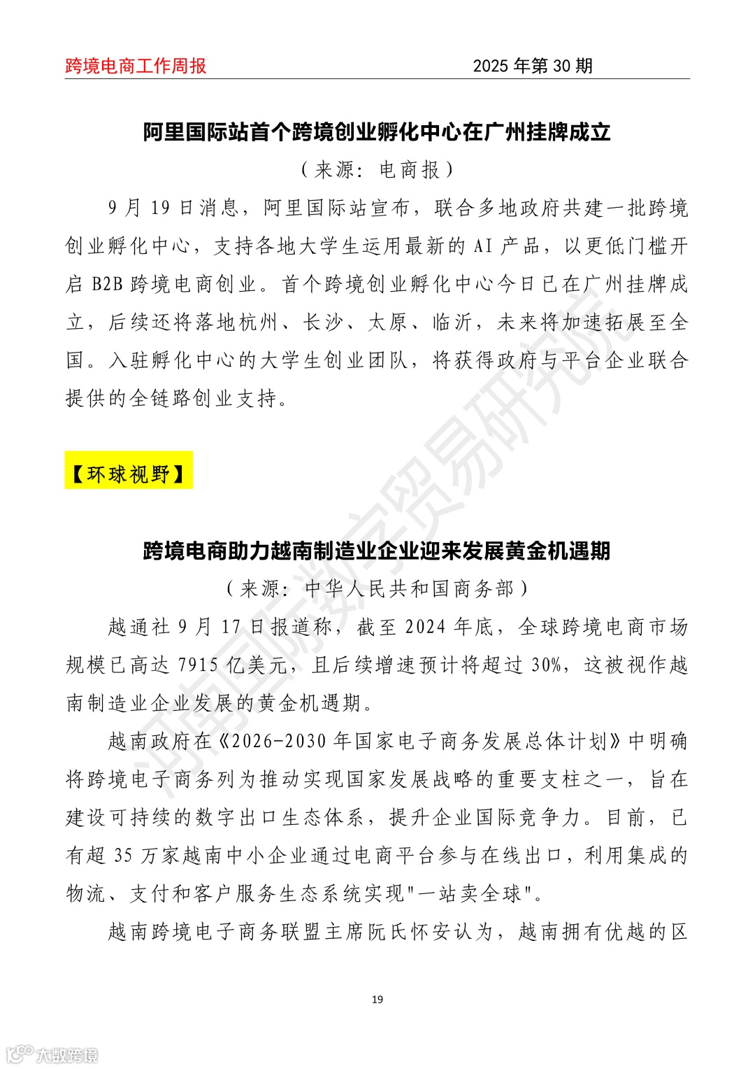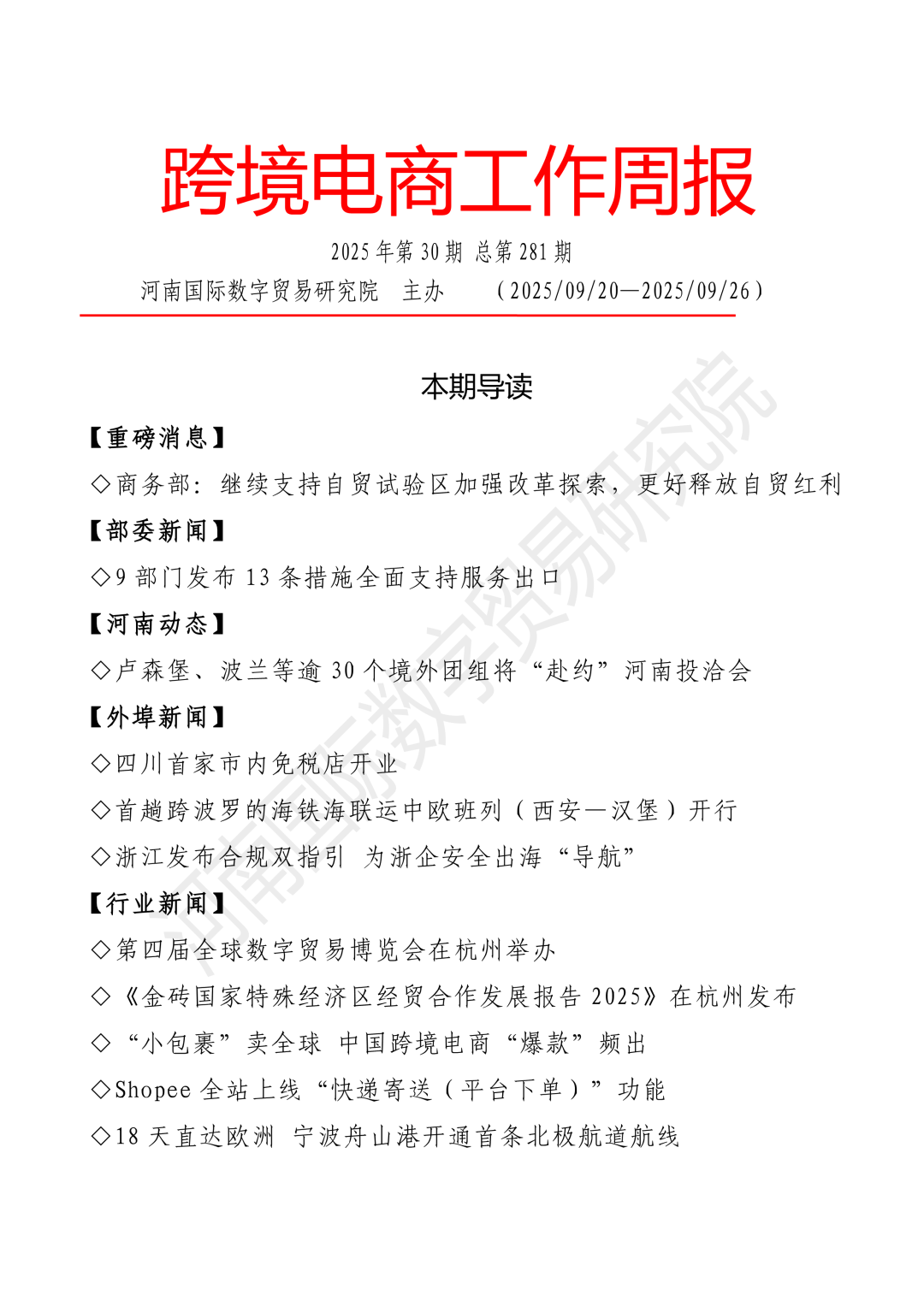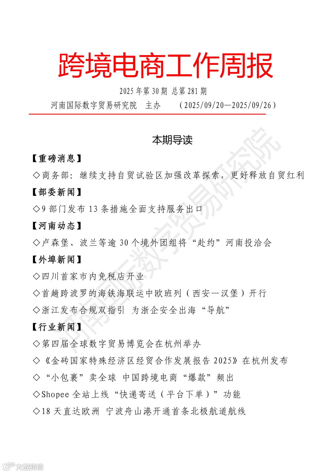 2025年第30期(2025/09/20—2025/09/26),跨境电商领域又发生了哪些事件,以下是河南国际数字贸易研究院为大家带来的本周外贸进出口、跨境电商平台、服务商及各地跨境电商最新动态回顾。