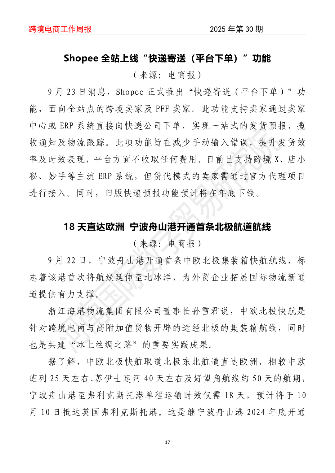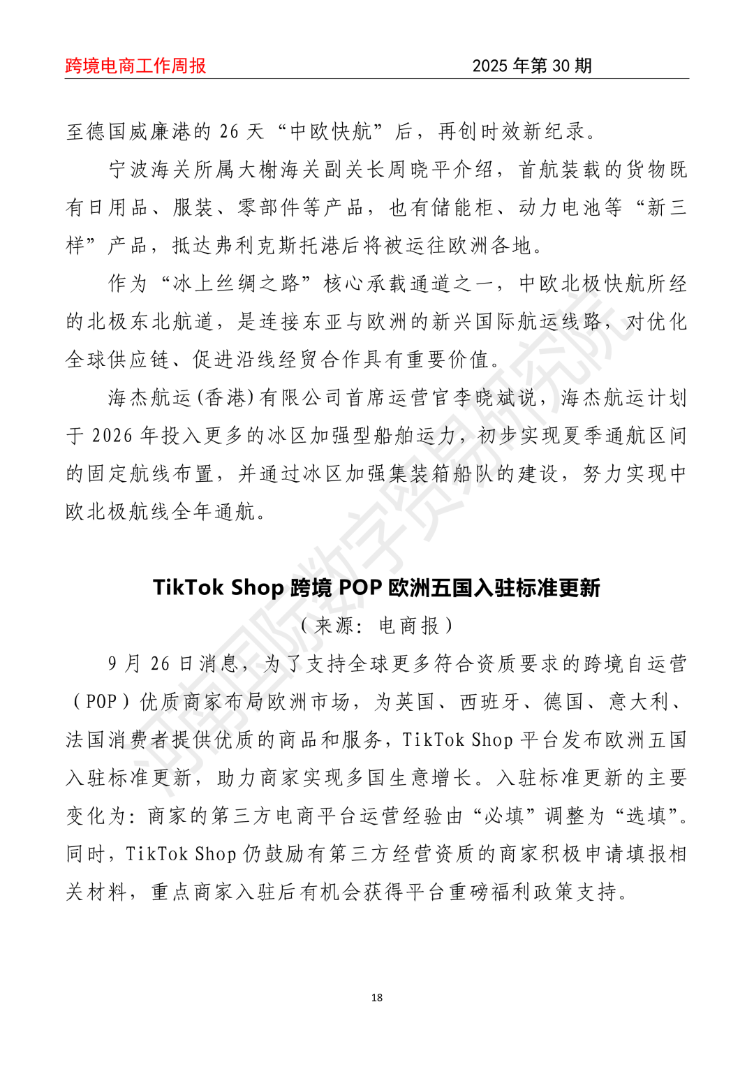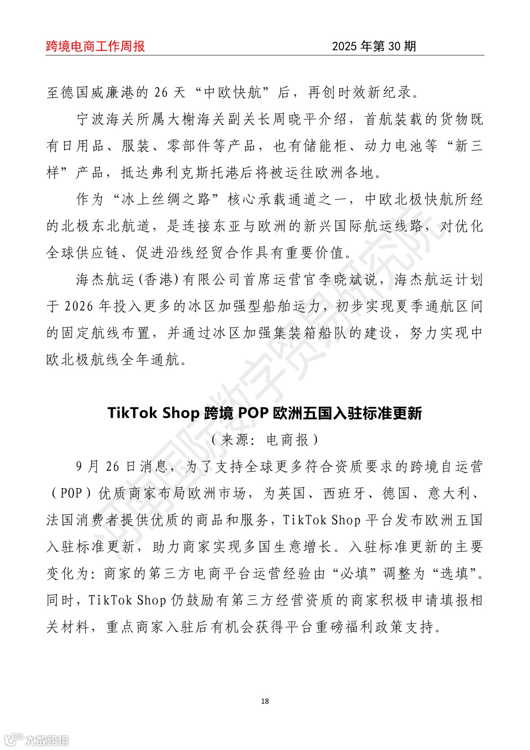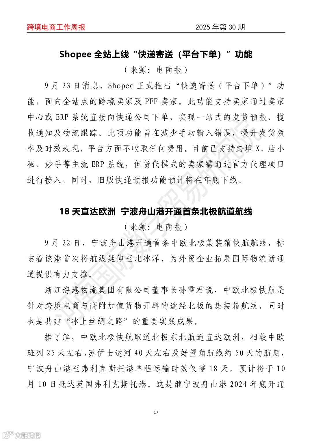 跨境行业活跃。Shopee全站上线“快递寄送(平台下单)”功能。宁波舟山港开通首条北极航道航线,18天直达欧洲。TikTok Shop跨境POP欧洲五国入驻标准更新。阿里国际站首个跨境创业孵化中心在广州挂牌成立。