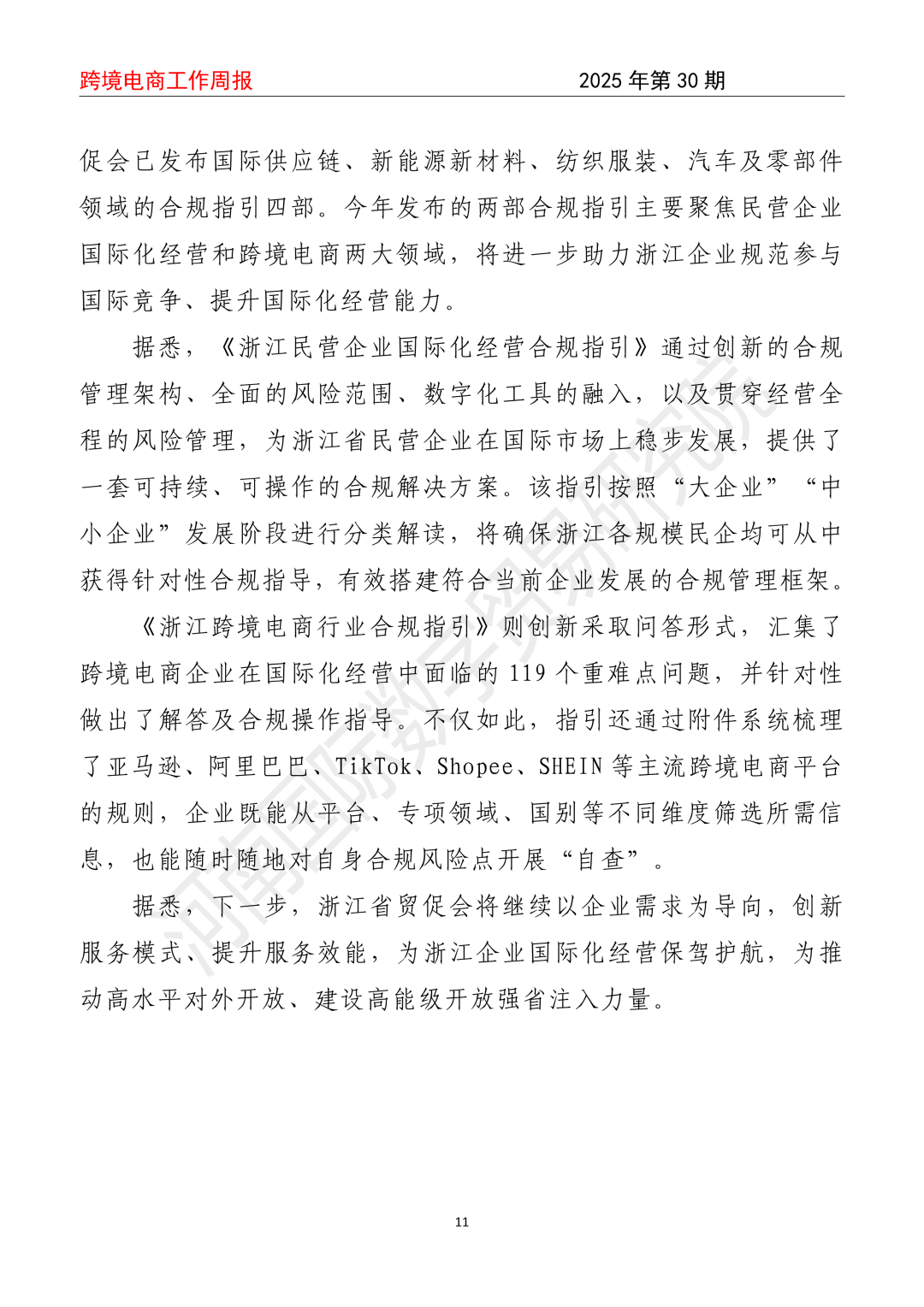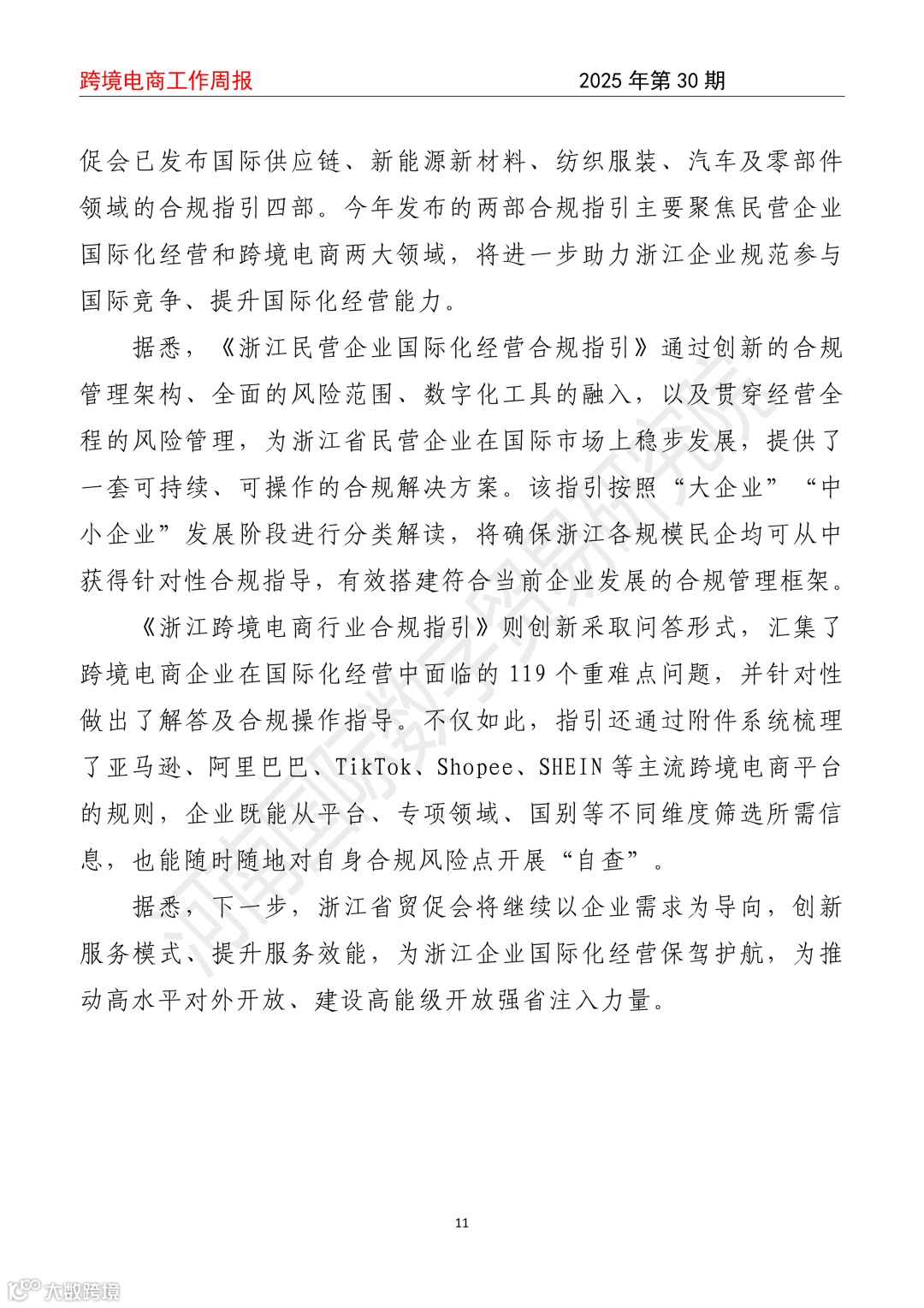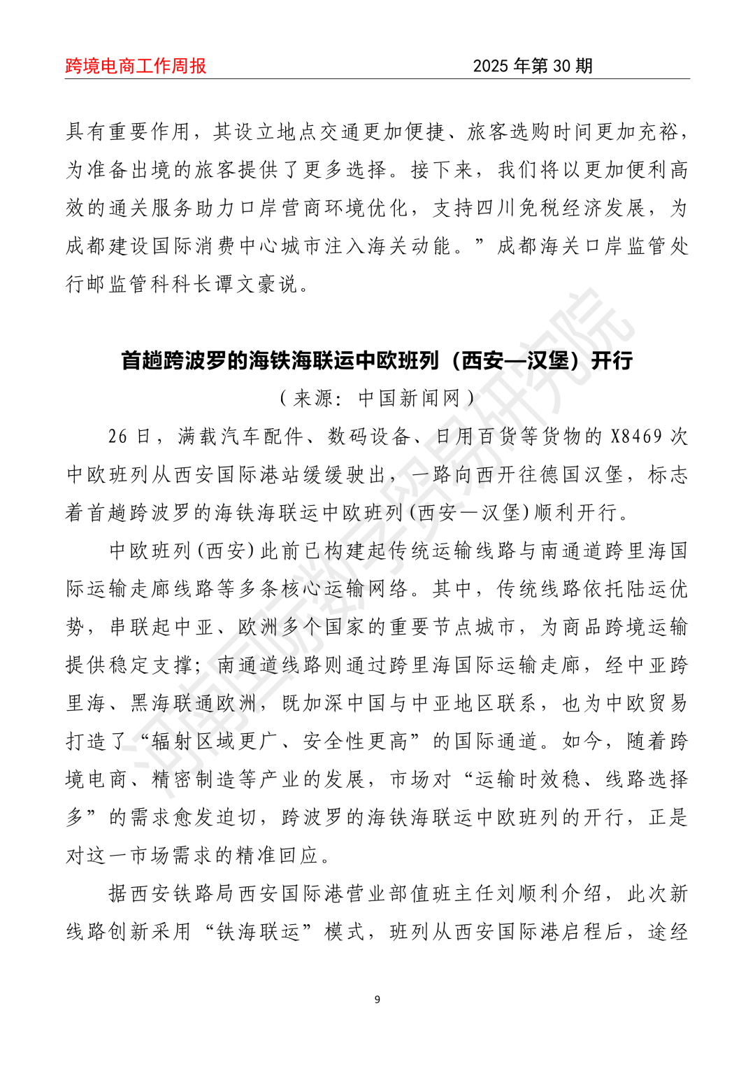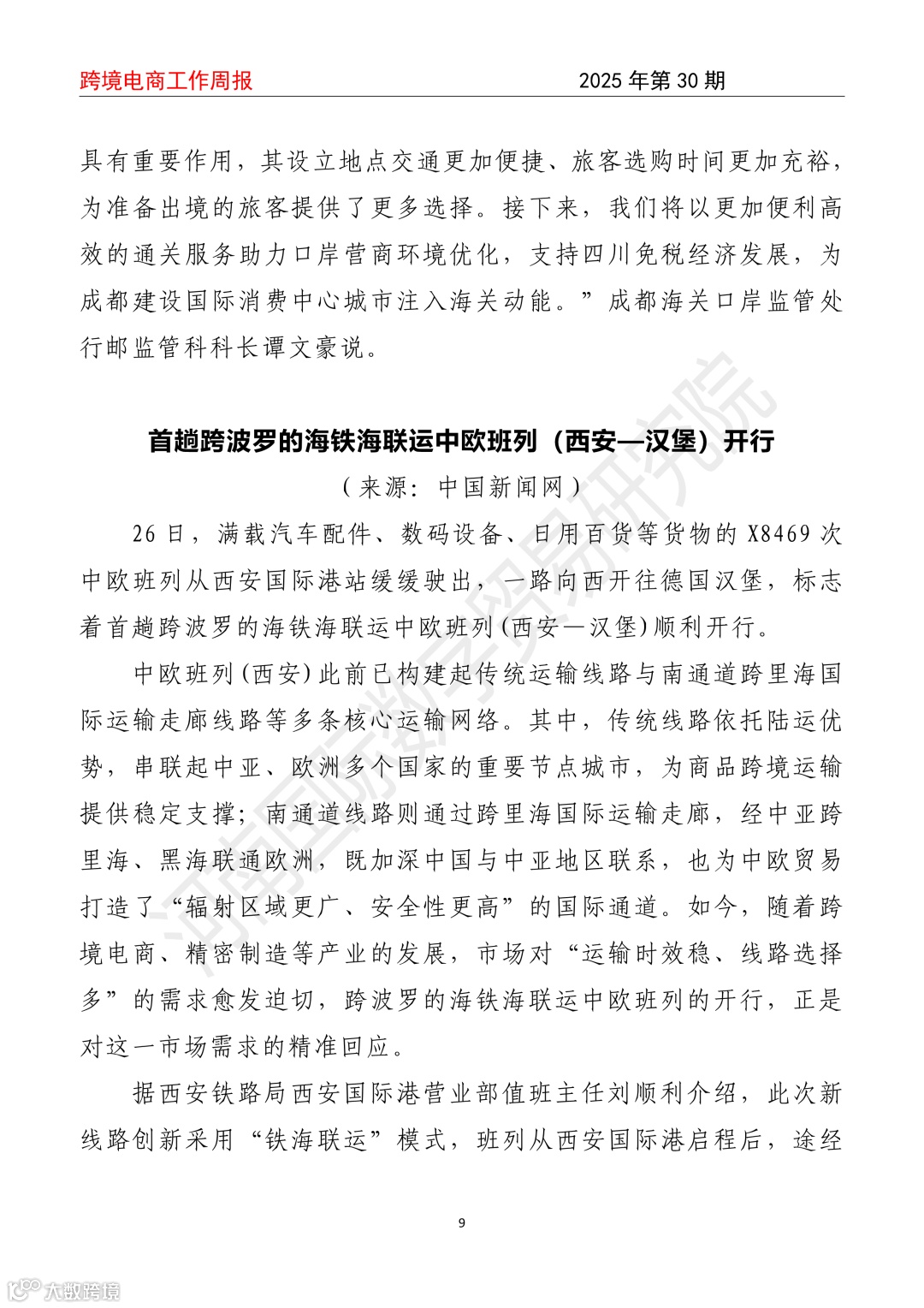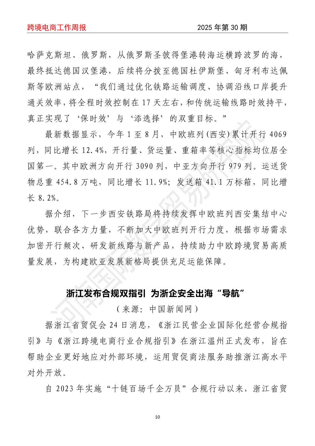 各地支持跨境电商发展。卢森堡、波兰等逾30个境外团组将“赴约”河南投洽会。首趟跨波罗的海铁海联运中欧班列(西安—汉堡)开行。《浙江民营企业国际化经营合规指引》与《浙江跨境电商行业合规指引》在浙江温州正式发布。