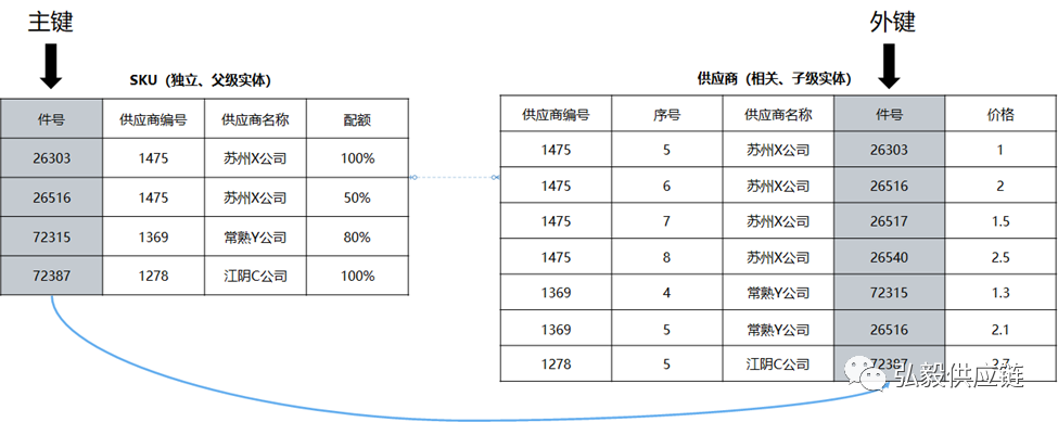 件号是SKU表的主键,它是一个唯一的值,可以识别SKU表中的每一行。然后在供应商表中,主键是供应商编号和序号,但每个供应商也有一个件号,它是一个有效的值,来自这个SKU表。