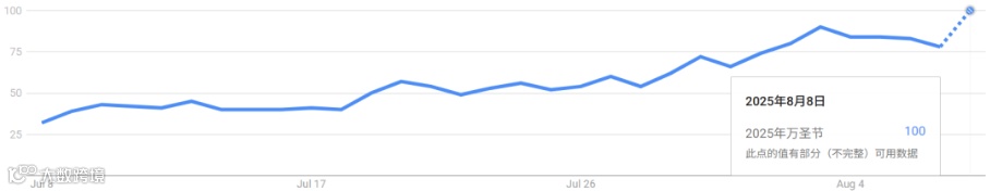 谷歌数据显示,"2025 Halloween(万圣节)"搜索量自8月初即突破75热度值(满值100),预计本周将迎首个峰值。
