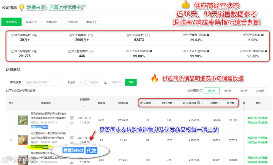 查看店铺的综合信息(包括经营状况、服务评分、店铺动态等)以及店铺商品历史销量,进一步判断供应商的综合实力。优先选择评价高、销量大的店铺,意味着他们的产品更受市场欢迎,服务质量更可靠。