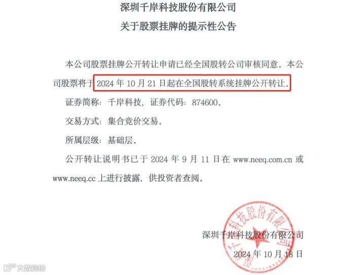 2024年10月21日,深圳千岸科技股份有限公司在新三板挂牌上市。