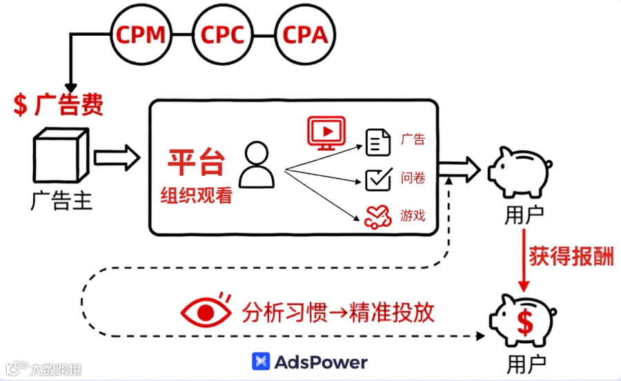 核心逻辑:基于广告行业收益分配,广告主支付广告费(CPM/ CPC/ CPA 等模式)获取精准曝光,平台将部分广告费分给看广告用户,形成 “广告主付费→平台组织观看→用户用时间换报酬” 流程