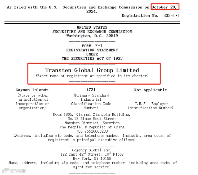 2024年10月29日,诚天国际供应链(深圳)有限公司(Transten Global Group)向美国证监会(SEC)正式提交首次公开募股(IPO)申请,计划募资不超过1000万美元,在纳斯达克上市,股票代码TTG。