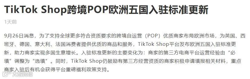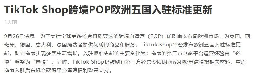 为抓住这一机遇,TikTok 近期对欧洲五国跨境自运营(POP)模式的入驻标准进行了关键调整 —— 将第三方平台运营经验从 “必填项” 改为 “选填项”,这意味着缺乏跨境经验的新商家也可入局,仅需满足核心合规要求即可:提供对应仓储国的 VAT 税号、具备本地发货能力、提交合法营业执照并符合平台治理规范。