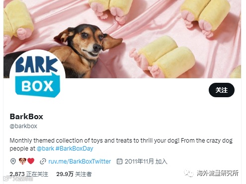 Twitter作为一种以“推文”为主要交流形式的社交媒体平台,Barkbox会向用户展示宠物对BarkBox产品的喜爱度,更新关于狗狗的玩具、Barkbox里有什么零食等内容。