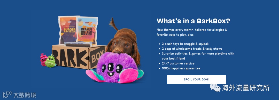 Barkbox成立于2011年,是一个专门给宠物汪星人提供小零食、玩具、服装和配套服务的电商平台,目前主要服务于美国和加拿大两个国家。