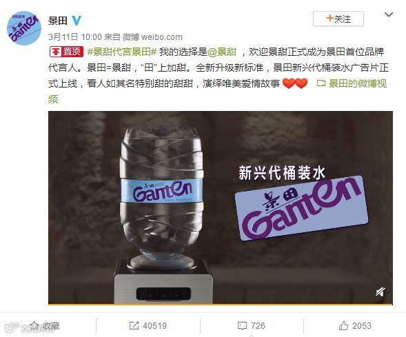 近日,饮用水品牌景田官宣景甜为品牌首位代言人,并上线一支延续百岁山风格的TVC广告。这一跨界合作迅速引起网友热议,“景甜和景田什么关系”的话题再度刷屏。