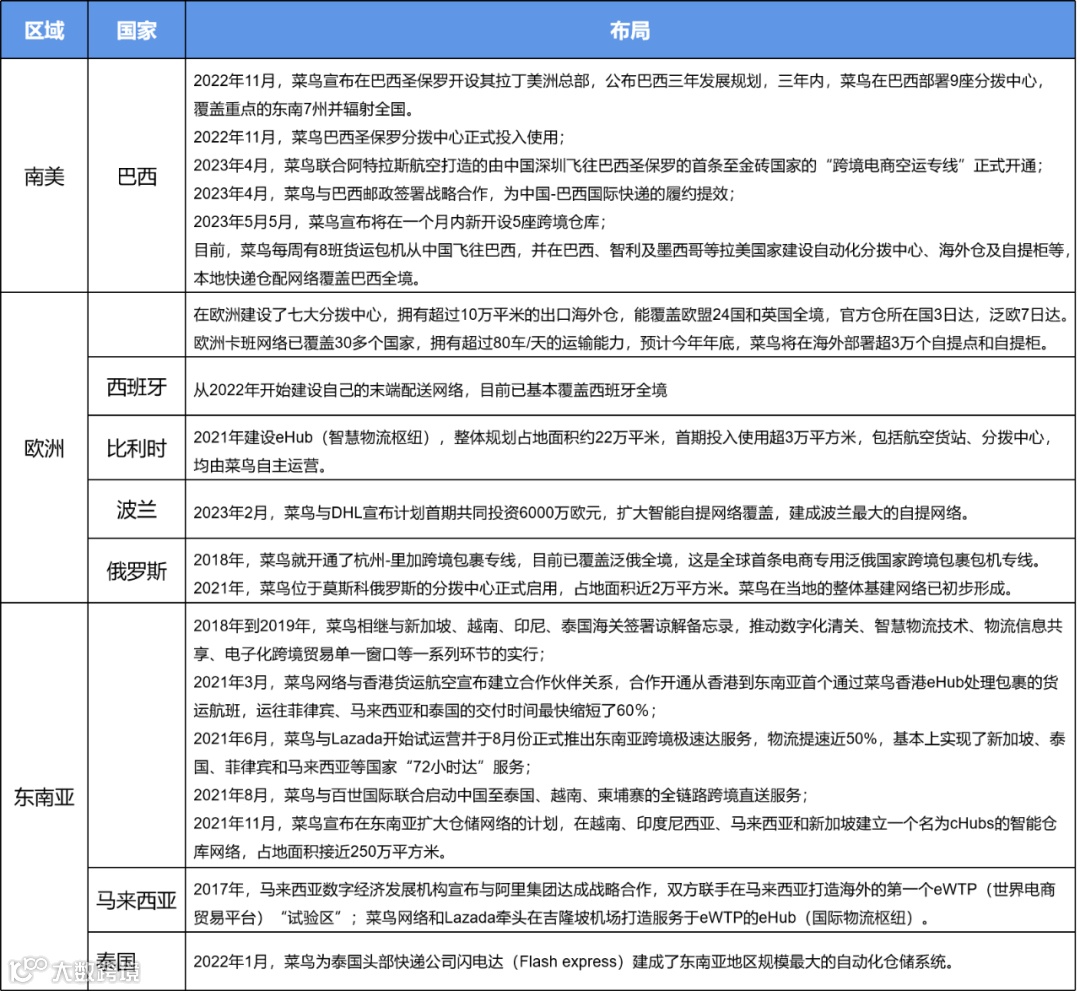 菜鸟在部分国家/地区的物流布局 根据网络资料整理