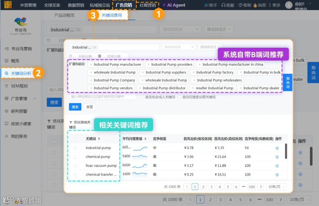 ①云平台→广告营销→布谷鸟营销→关键词分析,输入核心关键词,不仅能自动扩展B端词,并可一次性推荐多个关键词。