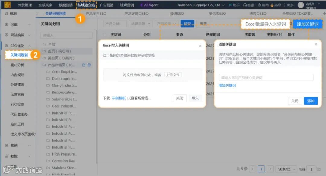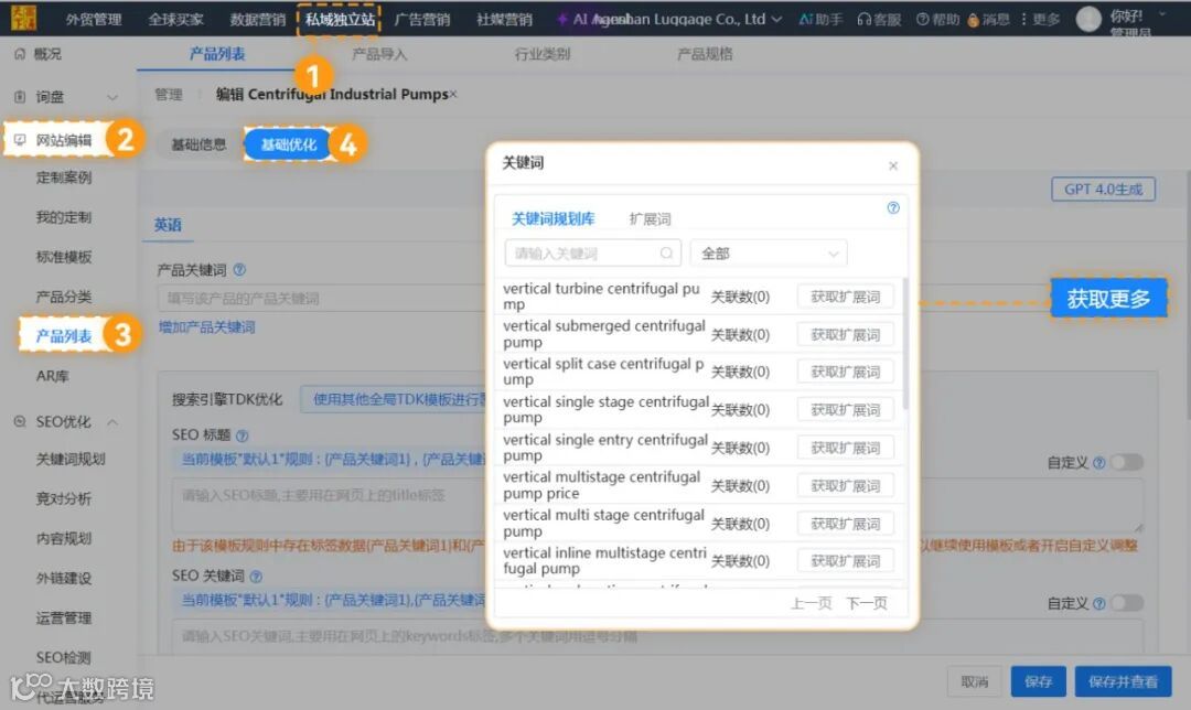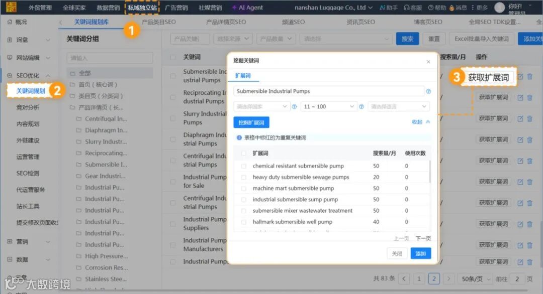 ②“云平台→私域独立站→SEO优化→关键词规划”,或者“云平台→私域独立站→网站编辑→产品列表→基础优化”,选中关键词,点击“获取扩展词”,即可选择国家、每月搜索次数、语言,得到扩展词。