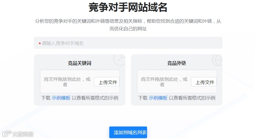 云平台用户使用“竞对分析”功能,输入竞争对手域名,即可一键智能获取对手关键词,并支持加入关键词或关键词库。