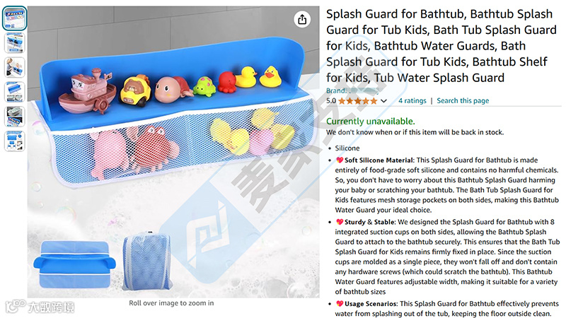 据我们团队了解,这款浴缸防溅板已于2024年5月30日在美国提出专利申请,并在同年11月5日获得正式批准,目前正受到外观专利的保护。因此,在销售类似产品时,需要特别留意,防止侵犯他人的知识产权。