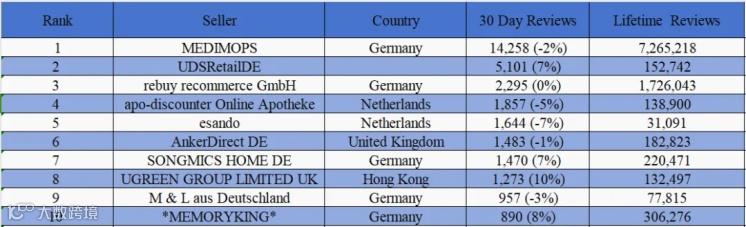 德国:在德国站榜单上的100名卖家中,69名来自德国,8名来自中国大陆,6名来自英国,4名来自中国香港,4名来自荷兰,其他的还有来自丹麦、法国、毛里求斯、波兰、韩国、瑞士、美国等。