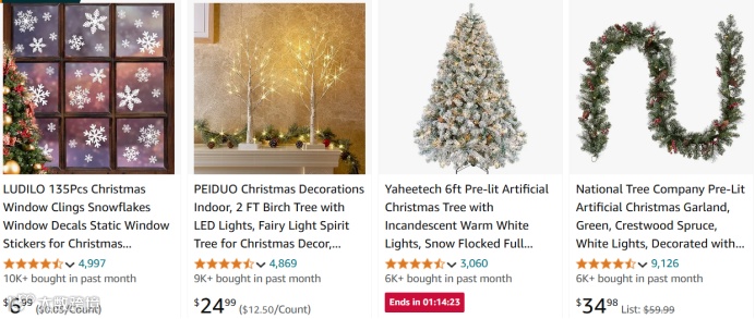 以窗花、LED灯带、圣诞花环为主,售价6~80美元,近30天售出1万+,获4.5分好评。