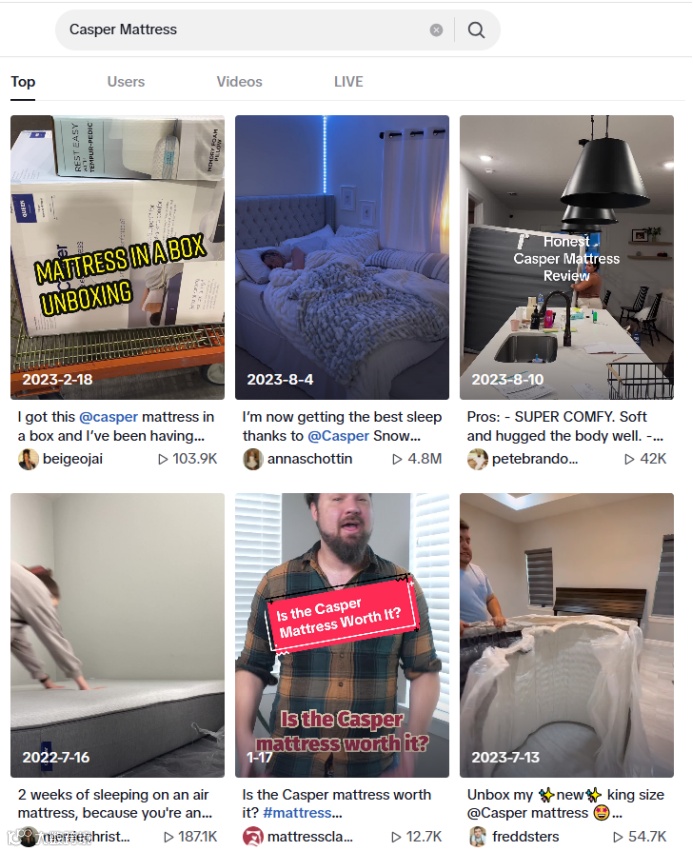 品牌2021年上线TikTok,截止目前,社交媒体点赞超940万次,关注人数超110万。搜索#Casper发现,一个产品的多个宣传视频播放量达几十万甚至几百万。
