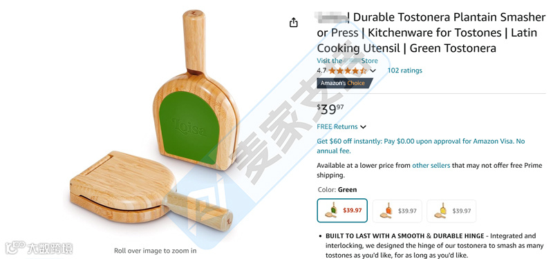 根据我们专业团队得知,这款Tostonera大蕉压榨器的原版品牌是loisa。该品牌于2022年9月8日在美国提交了外观设计专利申请,并于2024年11月5日获得批准。在销售类似产品时,卖家务必注意规范,避免侵犯他人知识产权。