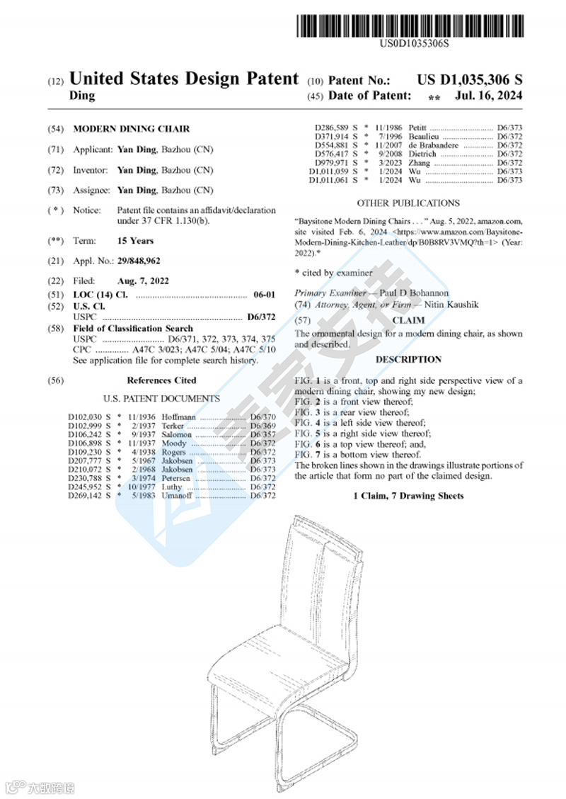 本案是11月8日Aptum律所代理国人卖家于2024年7月新下证专利:D1035306关于现代极简餐椅的维权!目前该案件处于立案阶段,暂未申请TRO冻结,相关卖家尽快排查!