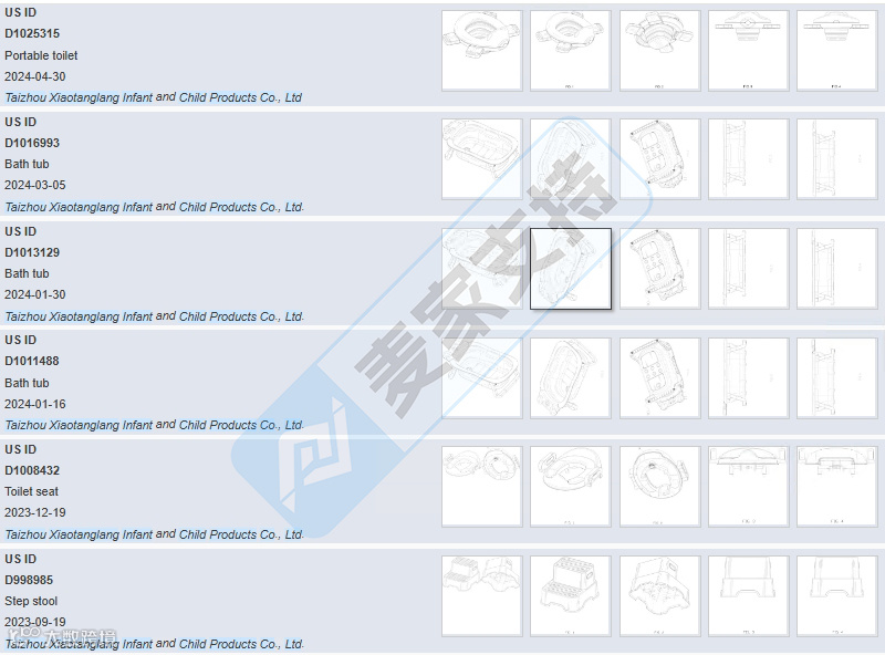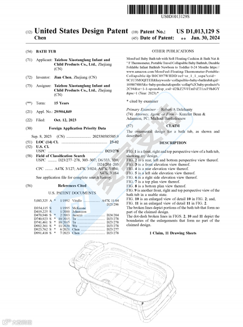 本案原告依旧是中国卖家持有的美国专利:D1013129,于2024-01-30下证,未经授权上架销售则会面临TRO冻结风险。除此之外,跨境卖家还需留意,原告方在美国共注册有11个专利产品,分别涉及移动厕所、浴缸、马桶座、便盆椅、脚凳等多个品类,需仔细甄别,小心踩雷。