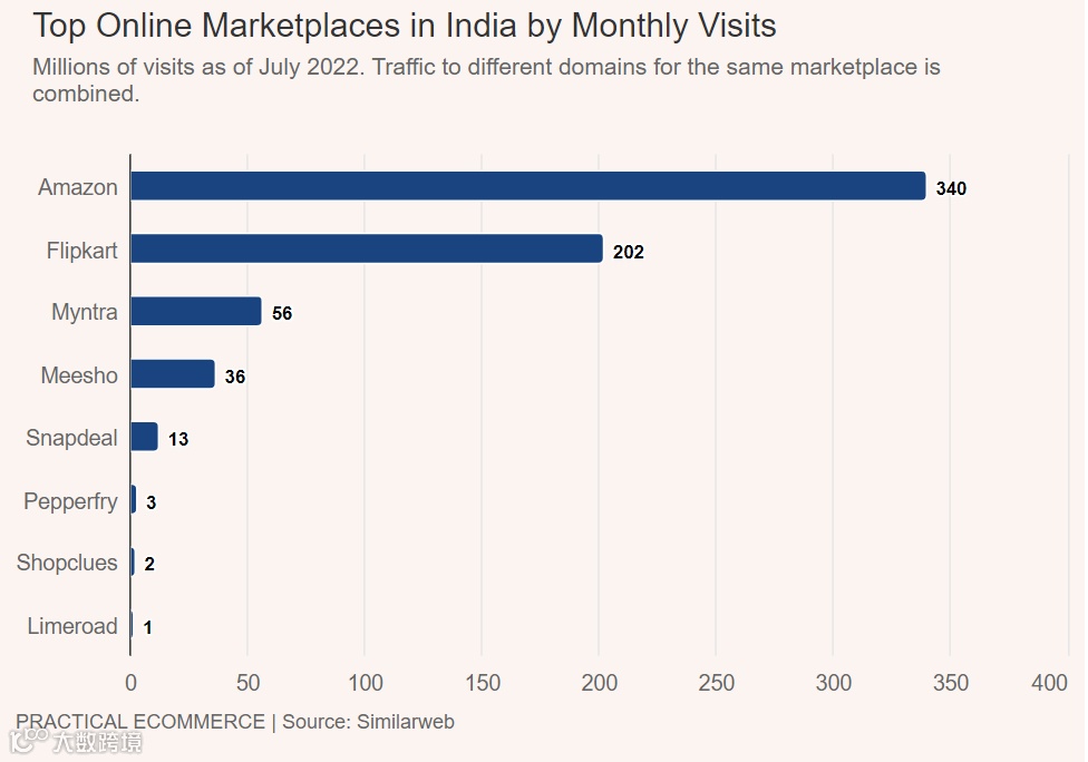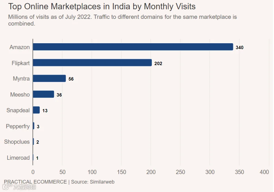 亚马逊是印度消费者最喜爱的平台,每月有23亿的访问量。第二喜爱的平台是沃尔玛拥有的Flipkart,每月有20亿访问量。