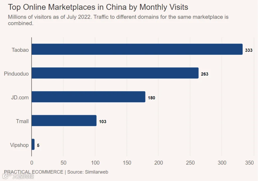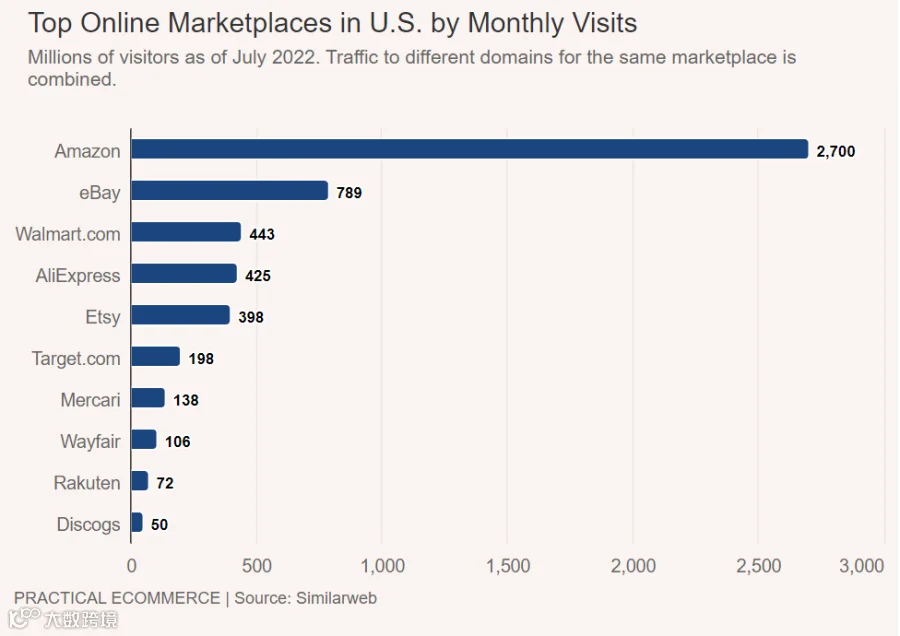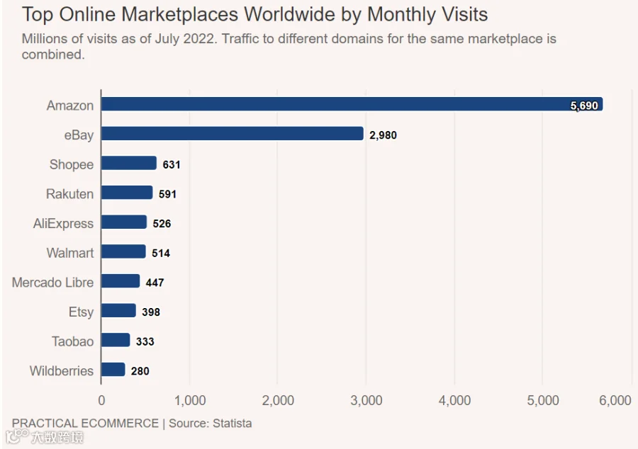根据Statista的数据,2022年7月份,亚马逊平均每月访问量达到53亿次,远远超过全球其他在线消费市场。eBay的每月访问量排名第二,大约为30亿次。