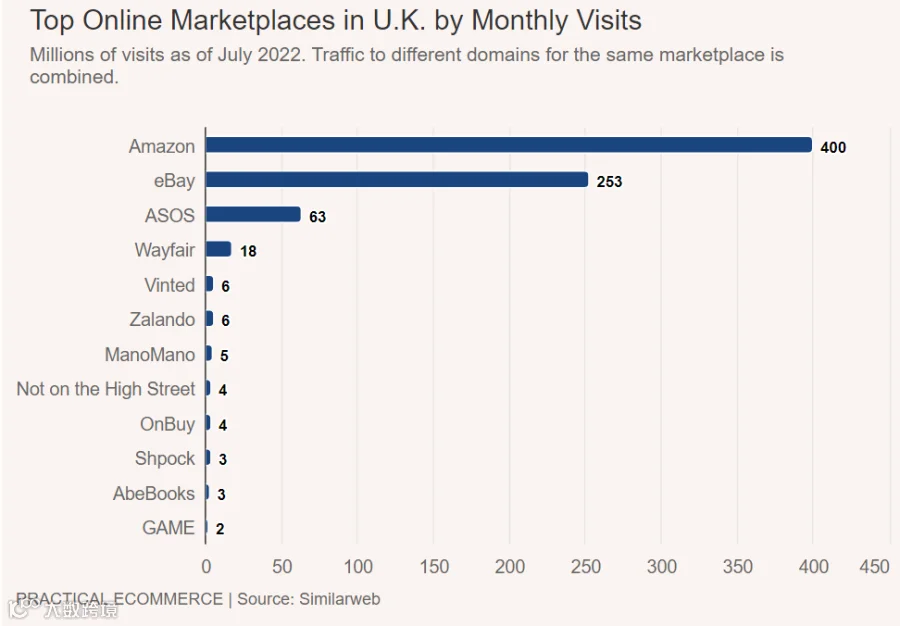 在英国,12个线上网站是当地消费者最喜欢的市场。其中排名前两位的是亚马逊和eBay。