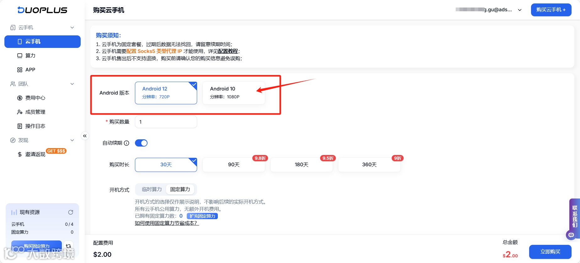 使用DuoPlus的用户,可在云手机购买页面通过点击”Android版本“右侧的选项,购买对应的安卓系统的云手机。