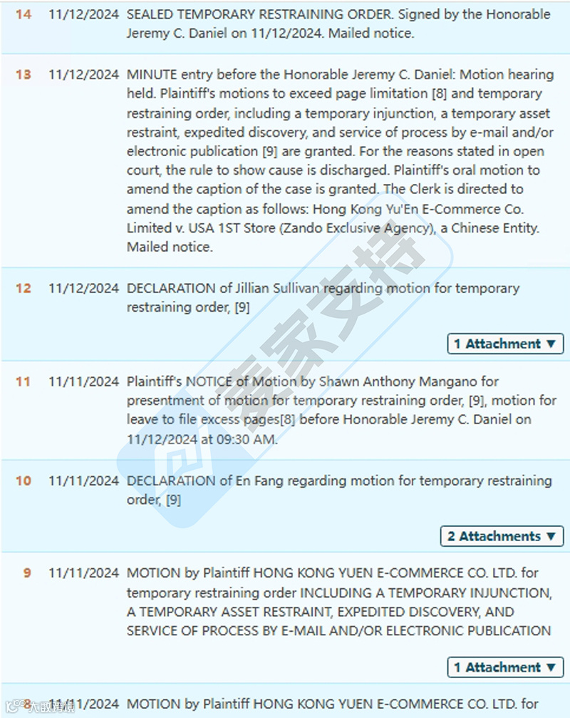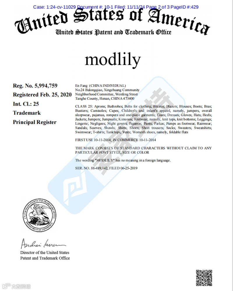 本案是Bayramoglu 律所10月下旬的一起匿名商标维权案,涉案商标为Modlily女装品牌,于2020年2月下证美国商标,注册品类为25类,涉及围裙、西装、比基尼、浴袍等。该案目前已于11月12日签署TRO临时禁令,涉案账户已被冻结,跨境卖家速查,避免未经授权误用。