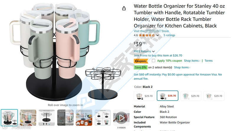 根据我们专业团队的了解,这款水瓶收纳架在2024年7月25日在美国提交了外观设计专利申请,并于2024年11月5日获得批准。因此,在销售类似产品时,卖家请务必注意遵守相关规定,避免侵犯他人知识产权。