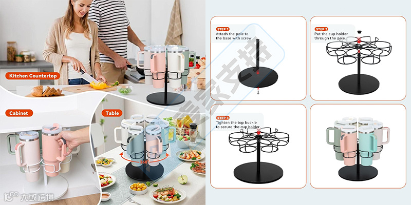水瓶收纳架采用了独特的旋转设计,非常便于取用。只需轻轻旋转6环杯架,就可以从各种角度轻松取出饮具,无论是存放在橱柜中还是厨房柜台上,都可以轻松实现。