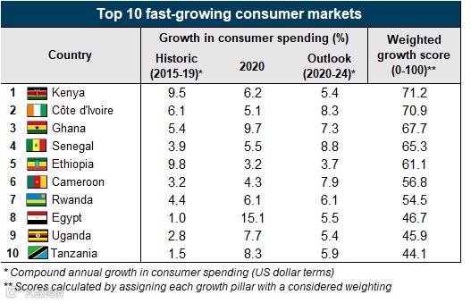 根据增长前景评分,以下是非洲增长最快的十大消费市场: