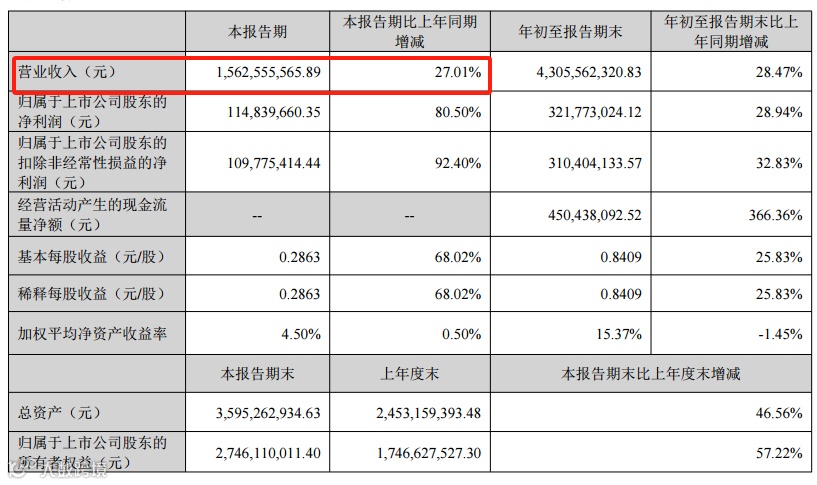 前三季度,公司总营业收入43.06亿元,同比增长28.47%;净利润3.22亿元,同比增长28.94%。