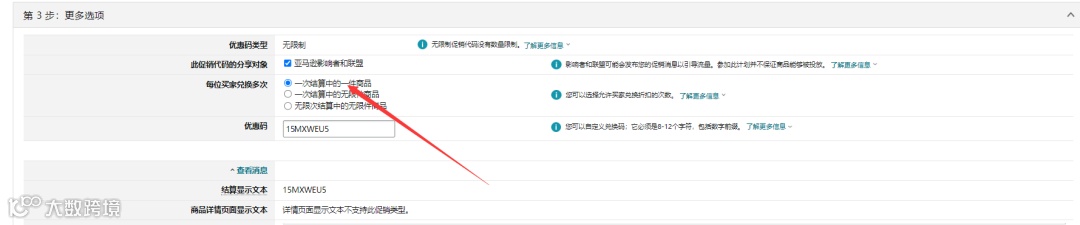 “一次结算中的一件商品”:任何一个亚马逊买家账户只能为一件产品兑换一次特定的促销;