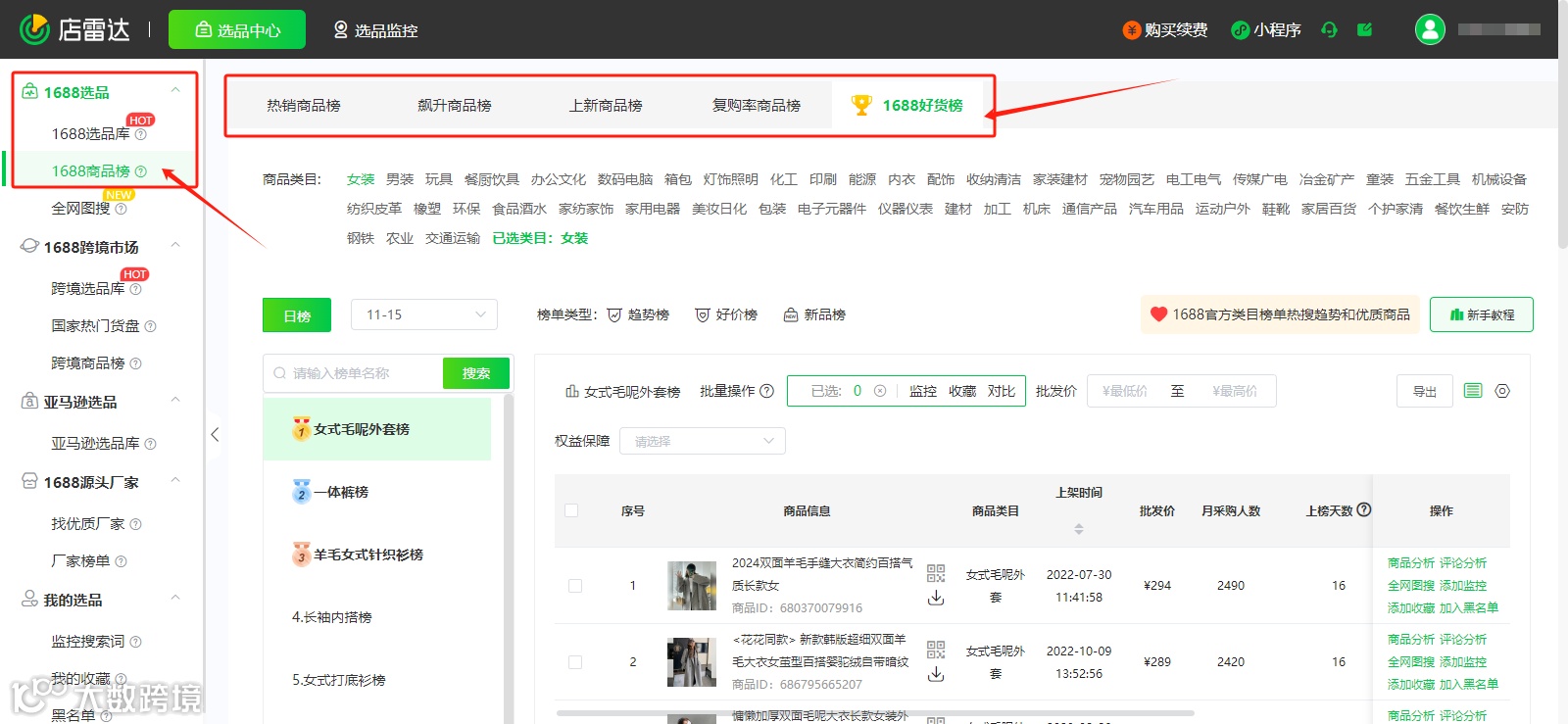 想知道近期1688上哪些商品比较受消费者喜欢,就可以点店雷达查看1688商品榜,里面有热销榜、飙升榜、上新榜、复购率榜、好货榜5个榜单,分析近期1688平台上用户热搜的关键词,发现当前热门的产品,从而为商家们在1688选品提供灵感。