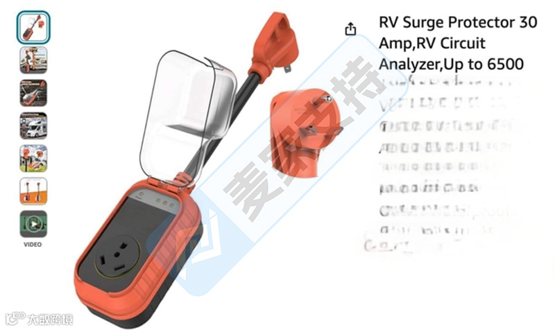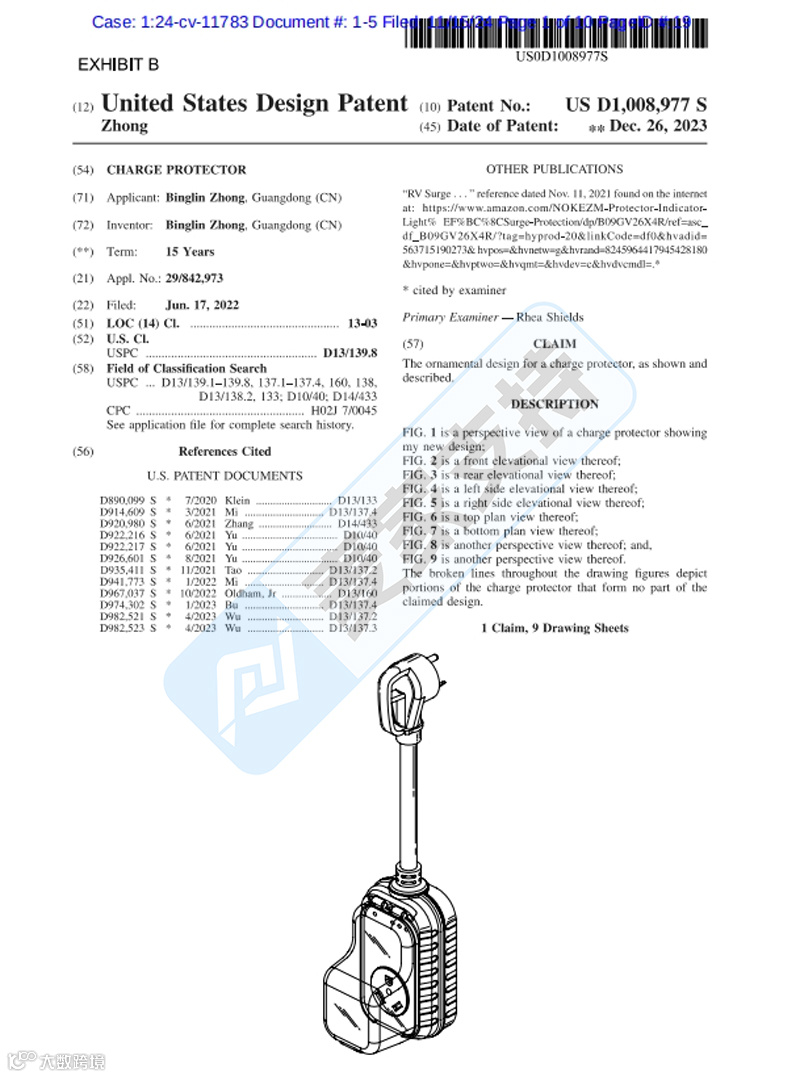 本案涉及一款国人充电保护器美国专利,专利号为:D1008977,于2022年6月17日提交申请,并于2023年12月26日取得美国专利证书。目前在亚马逊仅授权三个店铺销售,跨境卖家应对比专利细节进行排查,未经授权上架则会面临TRO冻结风险。