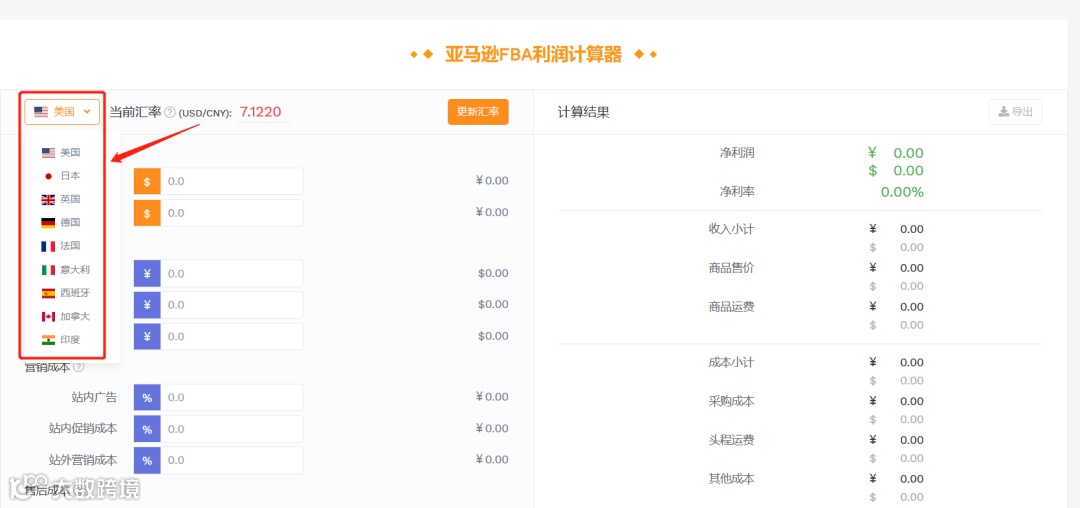 输入账户信息并选择所在的国家或地区:亚马逊FBA盈利能力计算器可以自动获取当下不同币种的汇率,目前可获取美国、日本、英国、德国、西班牙、法国、意大利、墨西哥、阿联酋九大站点汇率。