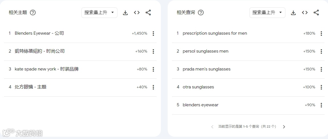 谷歌趋势提供了“相关查询”和“相关主题”功能,能显示与搜索词相关的其他热门搜索。这对跨境卖家来说,是一个不错的灵感来源。例如,卖家可以搜索“sunglasses”,然后在“相关查询”里就可以发现类似的热搜词,像“the cat who wore sunglasses”、“art the clown sunglasses”等,根据这些热搜词,卖家可以更深入地挖掘相关产品,从而找到最符合市场需求的新品。