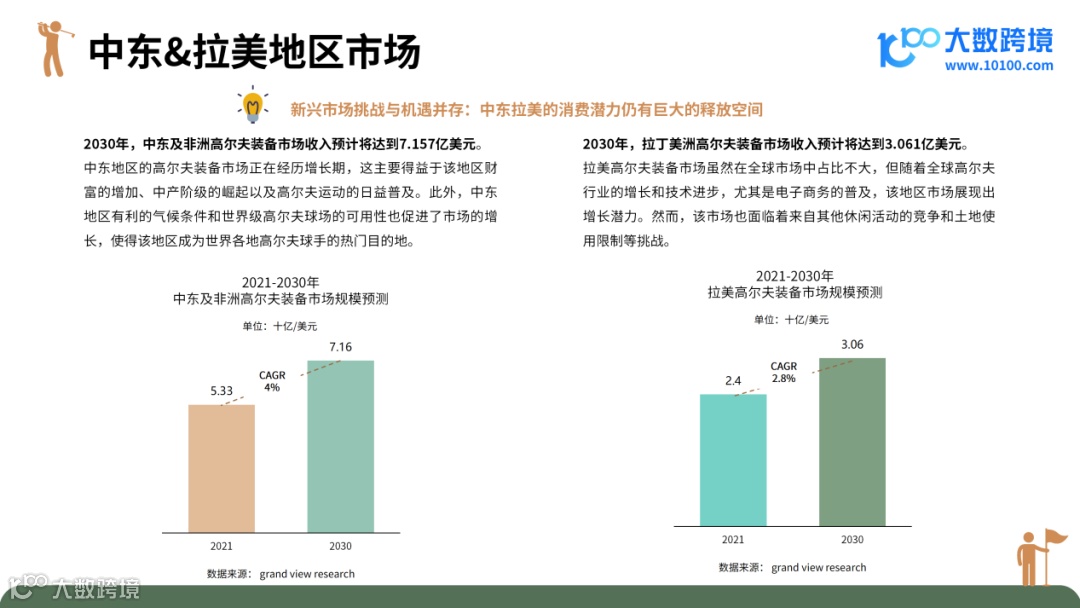 2030年,中东及非洲高尔夫装备市场收入预计将达到7.157亿美元,同年拉丁美洲高尔夫装备市场收入预计将达到3.061亿美元。