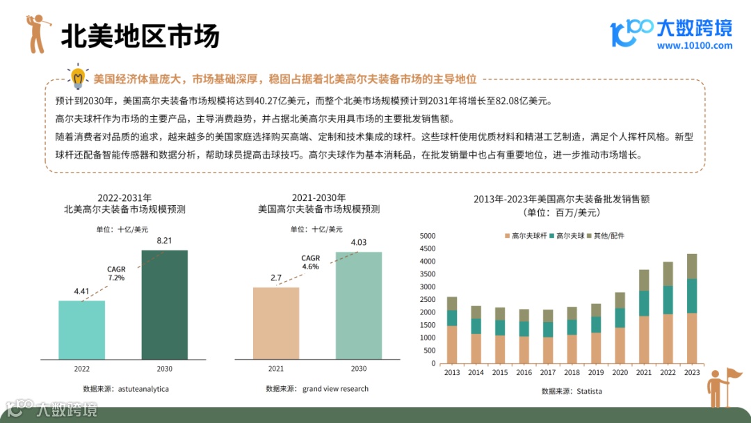 预计到2030年,美国高尔夫装备市场规模将达到40.27亿美元,而整个北美市场规模预计到2031年将增长至82.08亿美元。