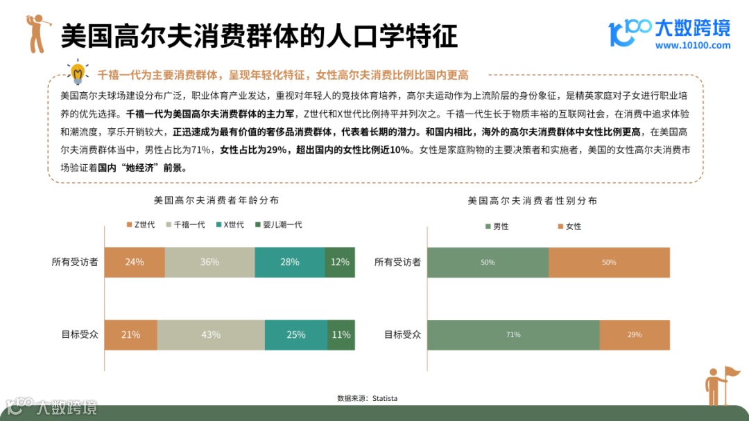 高尔夫运动作为上流阶层的身份象征,是精英家庭对子女进行职业培养的优先选择。千禧一代为美国高尔夫消费群体的主力军,Z世代和X世代比例持平并列次之。