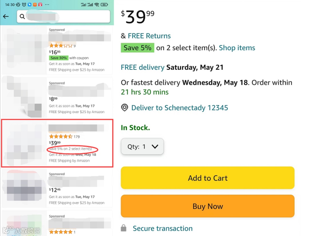 相同点是小绿标和小黄标在点进listing之前就可以在搜索结果页面都可以直接看到相关的关联营销,当然,如果有优惠券的话,这个位置是会被覆盖掉的,其展示位置都是在listing页面价格的下方。