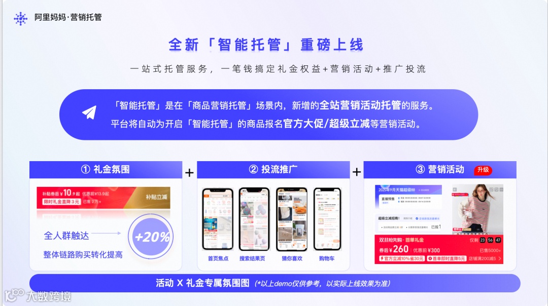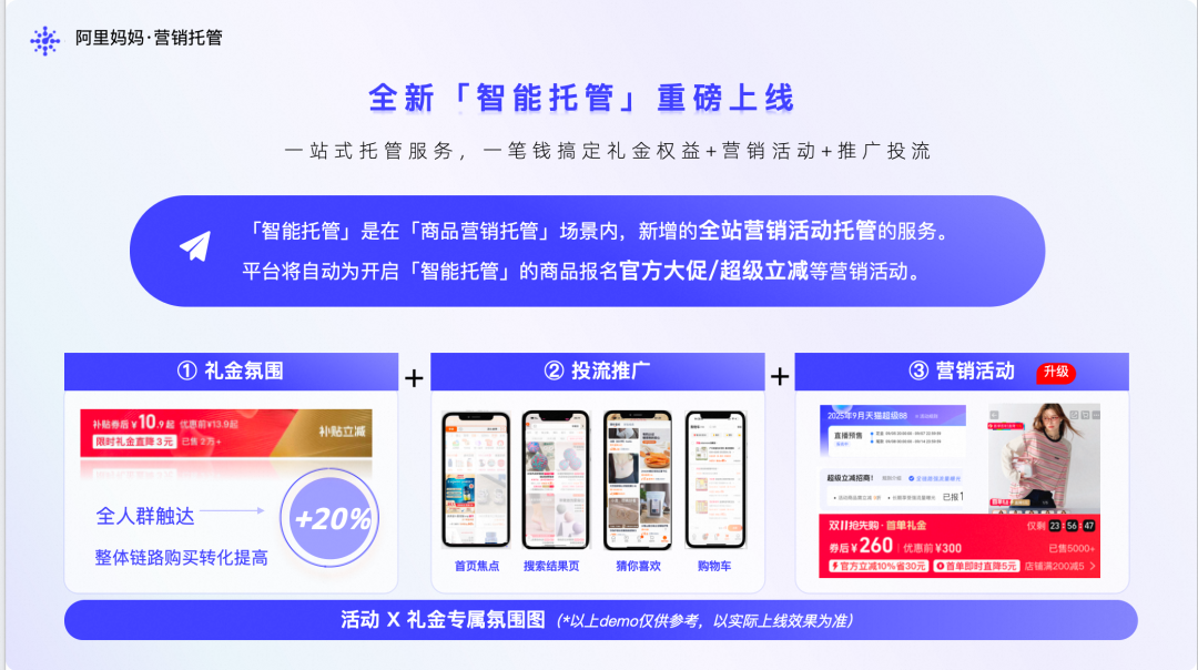 1、「智能托管」帮助商家全站智投,新增全站营销活动托管能力,营销场域更广阔;