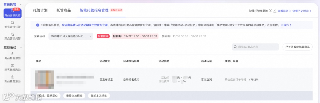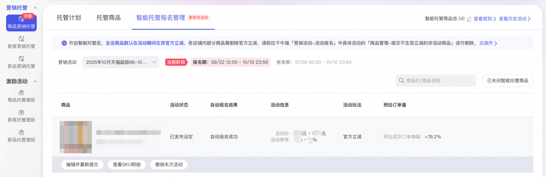 商家如想开启「智能托管」,系统会自动给出建议的活动价和推荐费率。报名成功后,平台将按照「活动价×活动费率」收取佣金,并智能分配到立减、礼金和投流等环节。