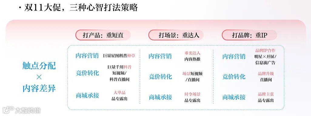 那么,在追求即时爆发的双11,如何同步实现这种长期心智的积累呢? 关键在于将心智建设分层,并匹配相应的打法。品牌可以聚焦于“商品心智”、“场景心智”、“品牌心智”三大维度,进行动态的内容策略布局: