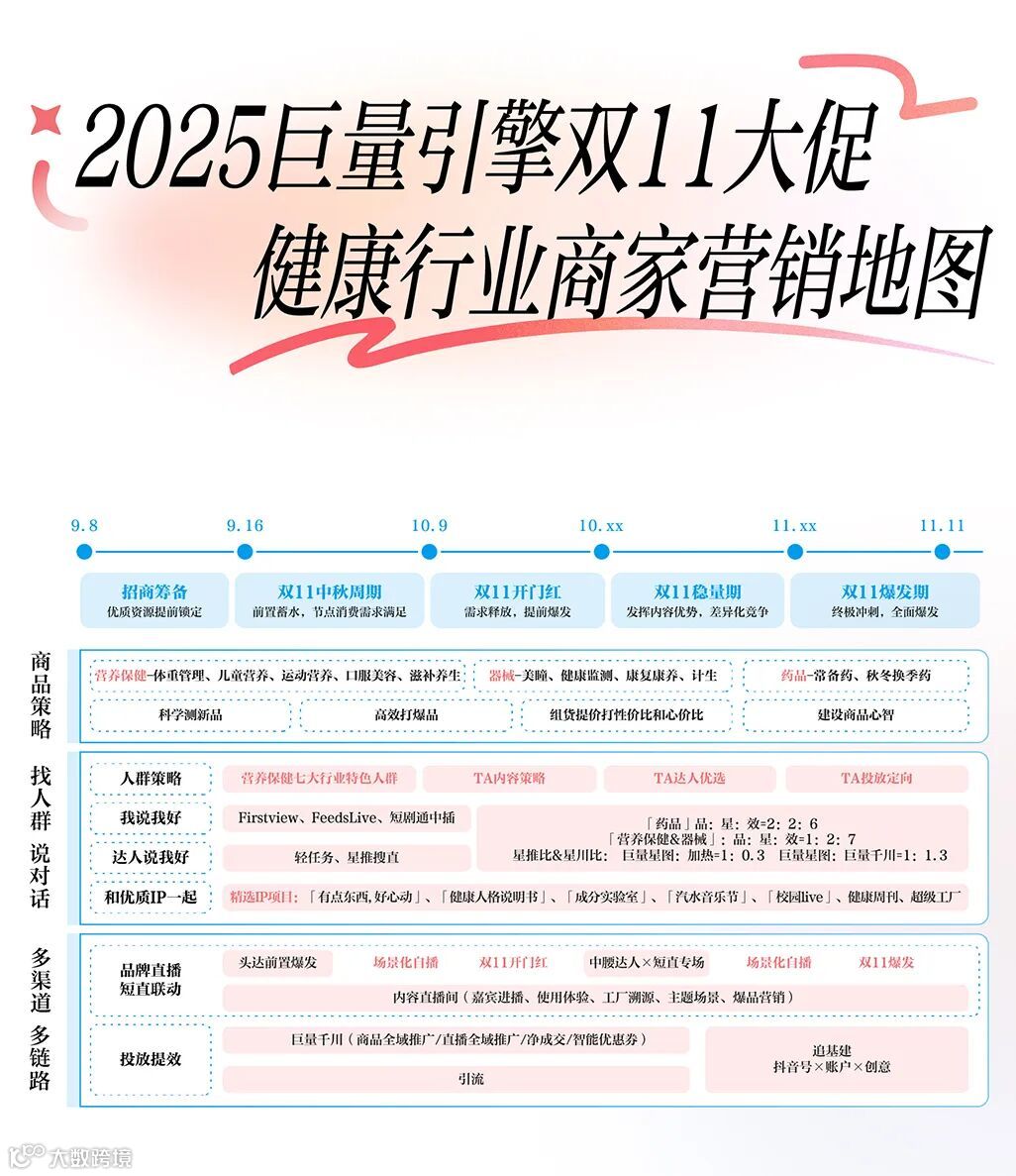 今年双11,尚有国庆、中秋等几个关键节点,商家可参考——国庆前蓄水、提前锁定资源;中秋及国庆后承接,加速内容发酵;双11开门 红抢跑、稳量期深化心智、爆发期全面冲刺的节奏,让品牌在用户心智中“有存在感”,把一次性的曝光逐渐累积为长期的记忆。