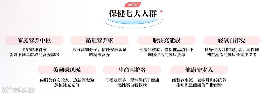 因此,巨量引擎基于“马斯洛需求×情感决策”模型,将健康消费者聚类为七大特色人群:家庭营养中枢、循证营养家、瓶装充能族、轻氧自律党、美潮乘风派、生命呵护者、健康守岁人。