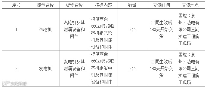2.1 项目概况、招标范围及标段(包)划分:2.1.1项目概况:国能(泉州)热电有限公司位于泉州市泉港区南埔镇柯厝村北侧。毗邻南埔围垦区,南侧紧邻港口铁路专用线,西南距泉州市区约55km, 东南距肖厝港区直线距离约1.5km,西距国道G228(滨海北路段)约100m、距国道G324(福厦公路)约8km,东北临湄洲湾海域。国能(泉州)热电有限公司已建成一、二期2×300MW+2×670MW 燃煤机组,规划有三期扩建场地。一期工程2×300MW两台机组于 2006 年 4 月建成投产;二期工程2×670MW两台机组分别于 2011 年 12 月和2012 年 4 月建成投产。本期工程在二期西侧预留场地进行扩建,建设条件较好。本期拟利用原规划预留场地建设三期2×660MW超超临界燃煤发电机组,同步建设脱硫、脱硝设施。现根据项目推进情况进行国能(泉州)热电有限公司三期(2×660MW)扩建工程汽轮发电机组及其附属设备采购公开招标。