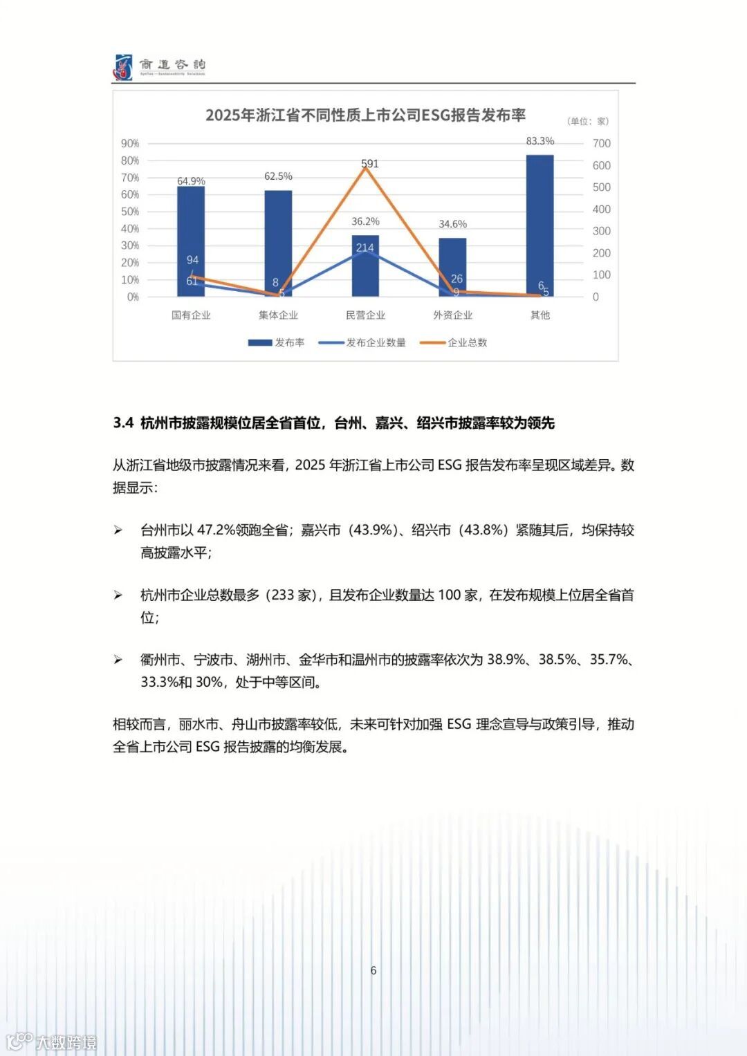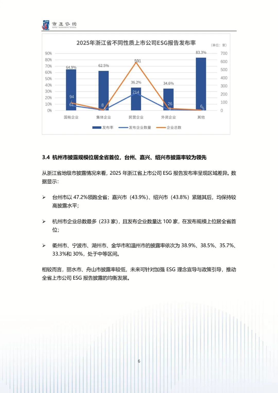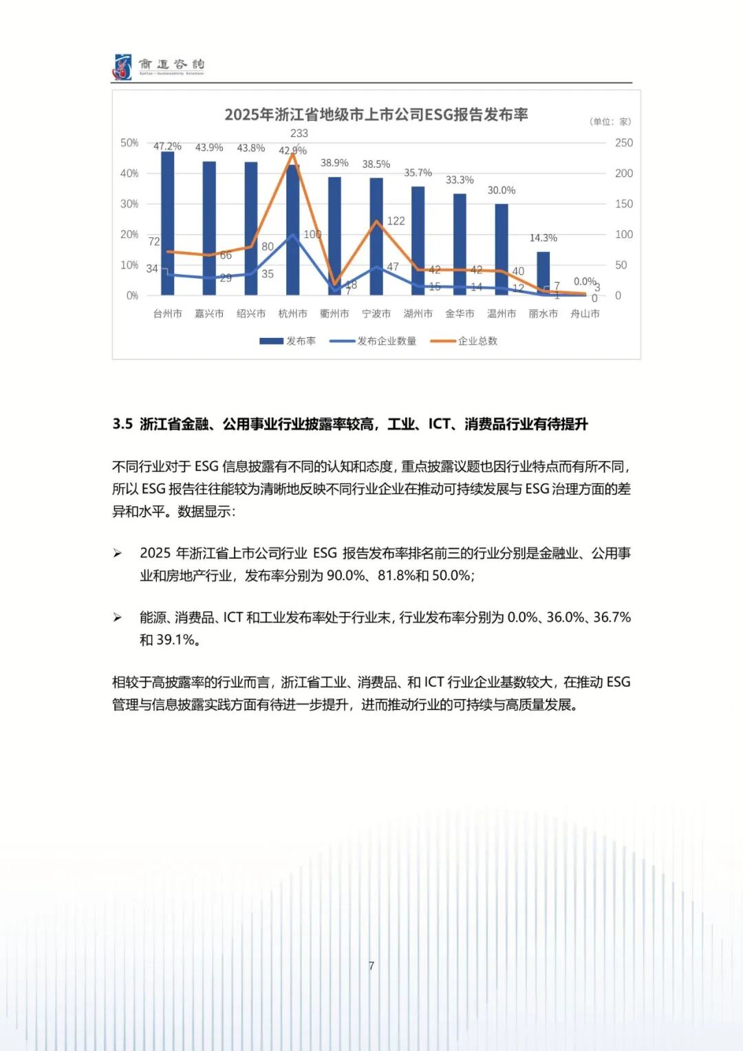 报告呈现了全省披露概况:2025年ESG报告发布率40.6%,强制披露主体发布率88.9%;民营企业披露率36.2%待提升,杭州披露规模居首,台州、嘉兴等市披露率领先,金融、公用事业行业披露率较高,工业、ICT等行业需加强。